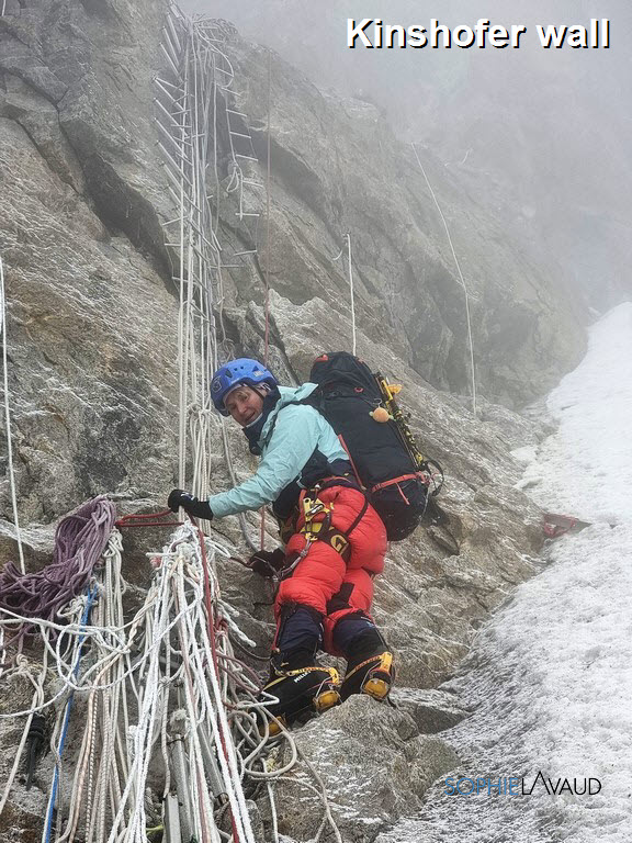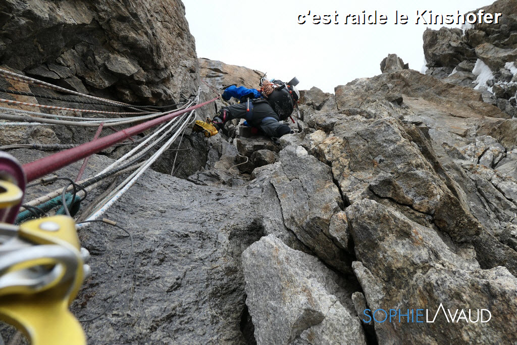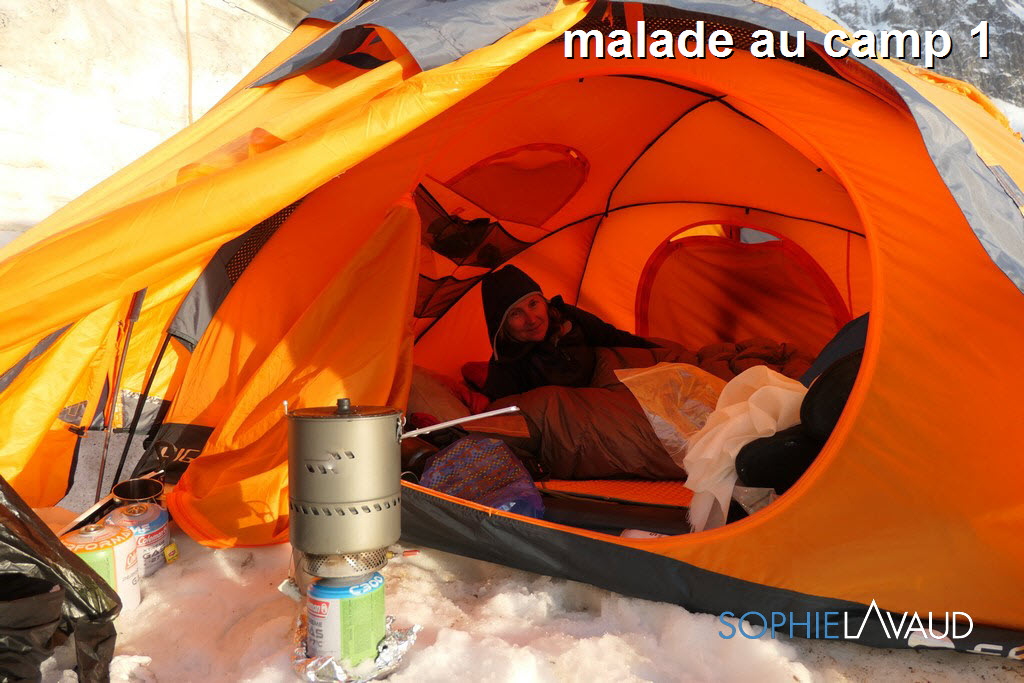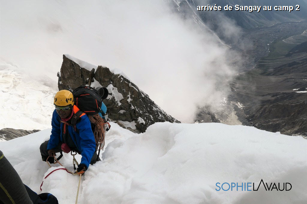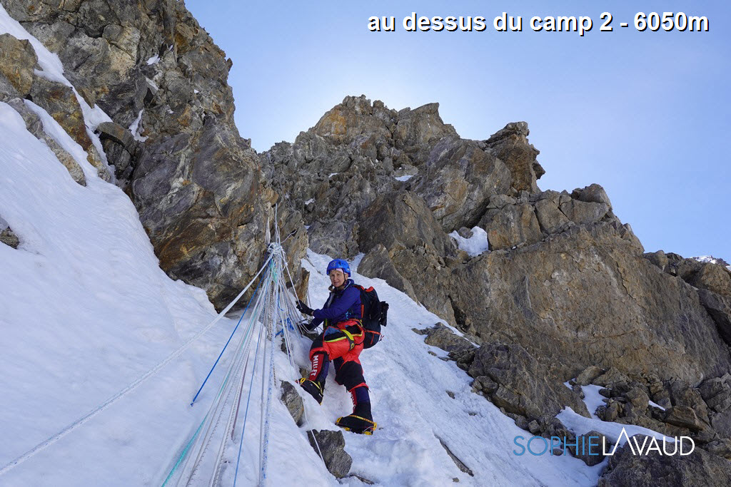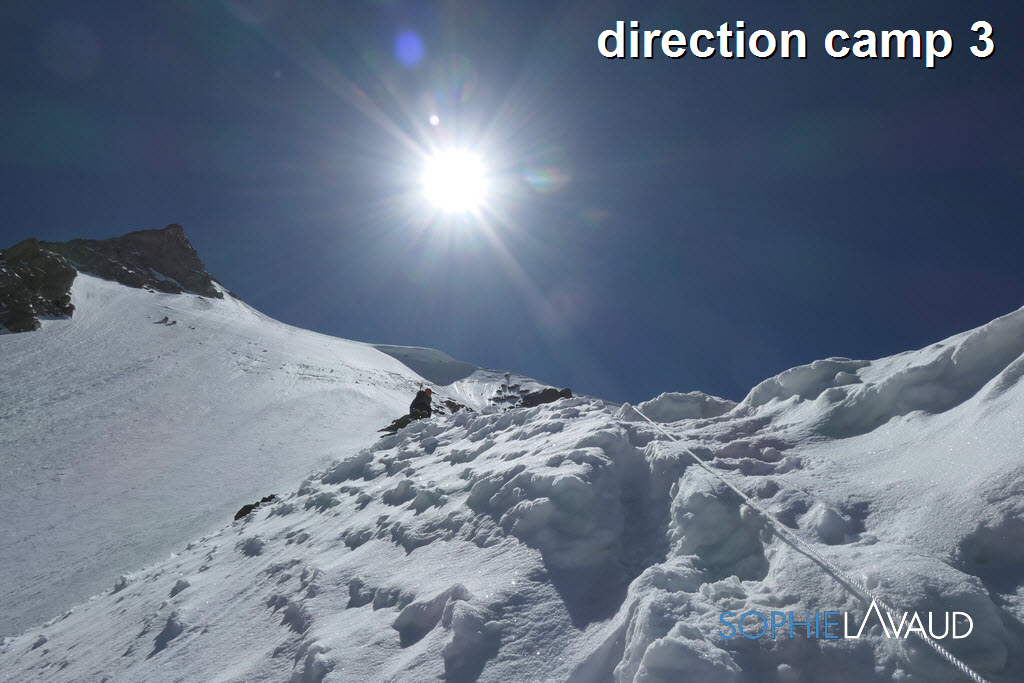 Le temps de remotiver tout le monde et de préparer notre « summit push », la montagne s’est énormément asséchée et est devenue encore plus dangereuse… Finalement cette deuxième fenêtre arrive et le matin avant de partir pour le camp 1, une petite diarrhée est bien là… pas grave je me dis… La montée au camp 2, avec 1050m de face glacée se terminant par les 150m d’escalade du mur Kinshofer est une horreur. C’est une roulette russe entre les chutes de glace et pierres, aucun endroit possible pour se reposer, les chevilles et les mollets explosent ! Avec Sangay et les amis, on en vient à bout en 12 heures. A la diarrhée s’ajoute le vomissement,… ça va aller…. On enchaine sur le camp 3 à 6800m c’est raide, c’est glacé, c’est soutenu,… ça va aller.