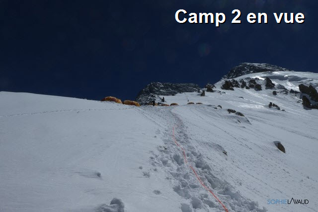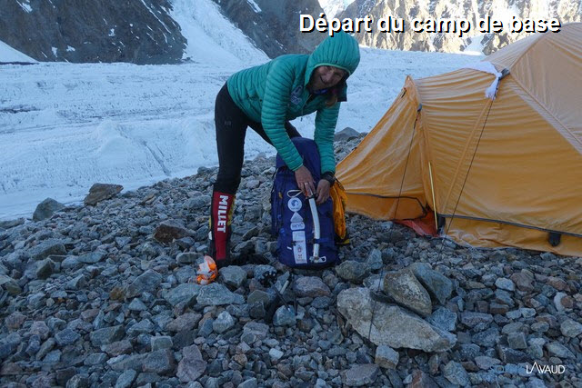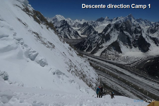Deux jours avec une météo de rêve, summit day weather ! Pas un nuage, pas un brin d’air, parfait. La vue depuis les pentes du Broad Peak est sublime. Un 180° de Concordia au K2 ! Un K2, imposant, majestueux, envoûtant… Mais les pentes du Broad Peak n’en restent pas moins dures et engagées et n’ont rien à envier au grand cousin d’en face. Quelques ressauts rocheux permettent de brèves pauses sinon l’inclinaison soutenue est quasi constante. Le camp 3 étant aux alentours de 7000 m, le summit push qui nous attend va être costaud avec plus de 1000 m de dénivelé… yep !! Mais nous n’en sommes pas là, pour le moment, je me suis réveillée avec le nez bouché et mal partout… Un bon petit rhume semble se profiler… Aurais-je pris froid sous la douche hier ?… Va savoir ? A suivre…