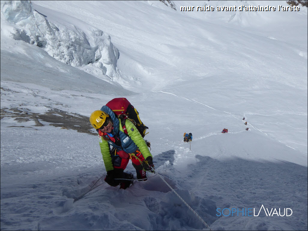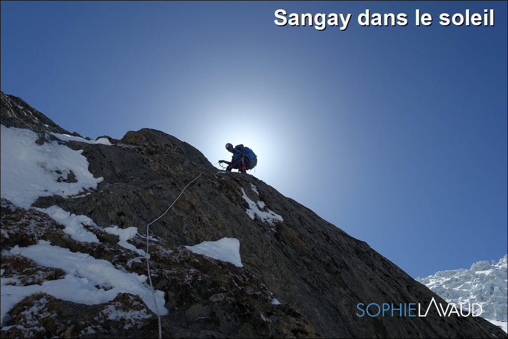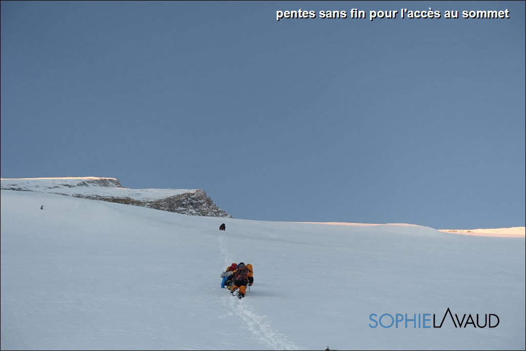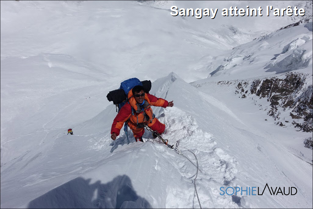 Après 1300 m de dénivelé, au camp 2 nous avions démonté la tente et pour le coup nous avons été bien inspirés car toutes nos affaires ont été protégées alors que deux autres tentes ont été détruites. Plateforme refaite et tente remontée nous pouvons enfin nous reposer. Le 21 nous partons au lever du jour pour cette longue étape direction le camp 3. On a de la neige jusqu’aux genoux et la progression bien lente jusqu’au pied de l’éperon des hollandais. Le cirque est majestueux mais à y regarder de plus près c’est assez terrifiant. Une sensation de roulette russe de passer entre les avalanches et les chutes de séracs. Sur l’arête, même si par endroit elle est bien effilée, on est plus en sécurité. Et comme rien n’est jamais gagné en Himalaya, il y a un énorme sérac à franchir de la taille de plusieurs immeubles au bout de l’arête pour atteindre le camp 3 à 6550 m d’altitude ! Le 22, l’étape est plus « modeste » mais les sacs sont lourds et l’altitude plus présente. Le camp 4, à 7050 m est dans un renfoncement du glacier, en pente, difficile de monter la tente. Vers 15 h nous sommes enfin posés, il faut boire, manger un peu et tenter de dormir. Nous décidons de partir vers 22h en direction du sommet. Un premier mur en glace gigantesque nous met tout de suite au parfum, puis ce sont de longues heures dans une neige profonde, ça n’en finit plus. Le léger vent bien froid qui souffle suffit pour recouvrir la trace en quelques minutes. Les premiers rayons du soleil sont les bienvenus. La remontée et la traversée des pentes sommitales sont interminables également… En fin de matinée, nous arrivons au pied du « couloir des français ». Le doute est à la hauteur de la masse de neige à tracer pour ouvrir ce couloir et il reste encore 200m de dénivelé. Nous y parviendrons 4 heures plus tard !! youpi trop bien, le sommet !! Ce que nous avons monté en 17 heures nous le redescendons en 4 heures, certains mettrons plus de 8 heures. Incapables de manger, avec Sangay nous nous écroulons dans notre tente au camp 4 trop contents. En 8 heures le lendemain avec tout notre barda sur le dos, nous rejoignons le camp de base 2850 m de dénivelé plus bas, dans une grosse neige lourde, il faut descendre vite… c’est dangereux…mais on s’en fou on a le sommet dans la poche. Au camp de base, je regarde le sommet et je luis dit « Salut !! Never again !! »