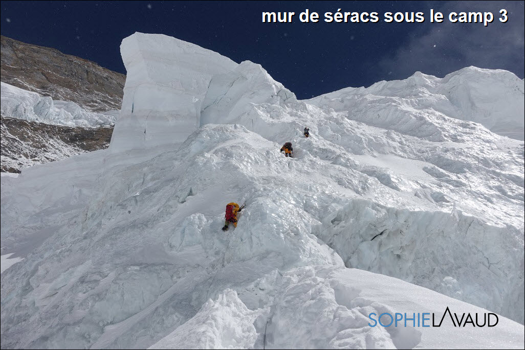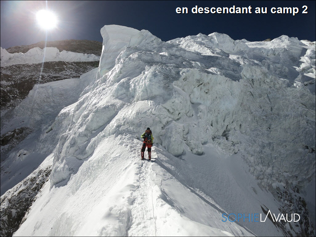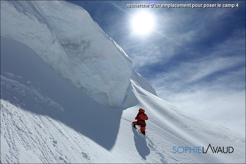 Partis avec Sangay le 20 avril du camp de base, nous sommes directement montés au camp 2. Yan nous avait annoncé une belle fenêtre météo. Le manque de vent et un soleil de plomb rend la progression difficile et dangereuse avec une neige molle et profonde.