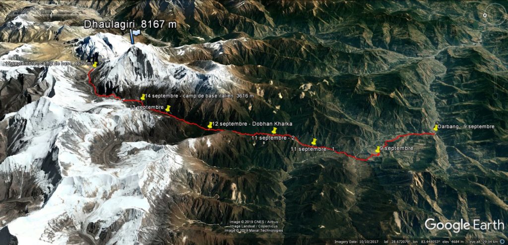Quelques nouvelles, à l'issue du trek d'acclimatation pour le camp de base du Dhaulagiri que nous venons d'atteindre (4639 m)Chronologie du trek :