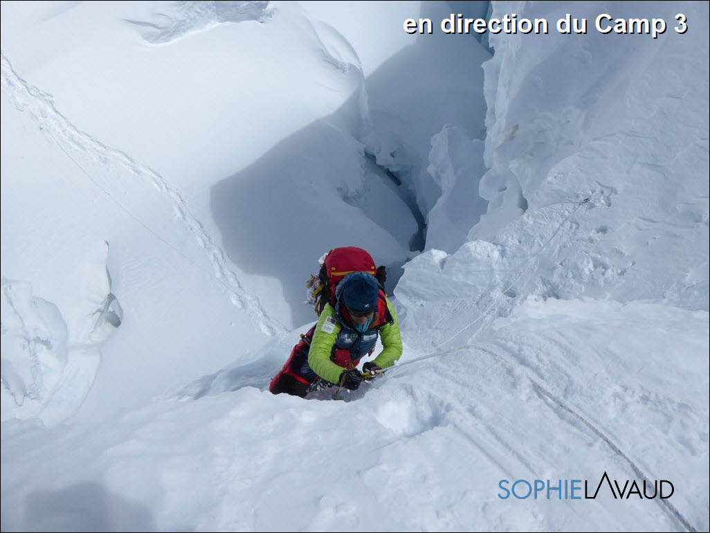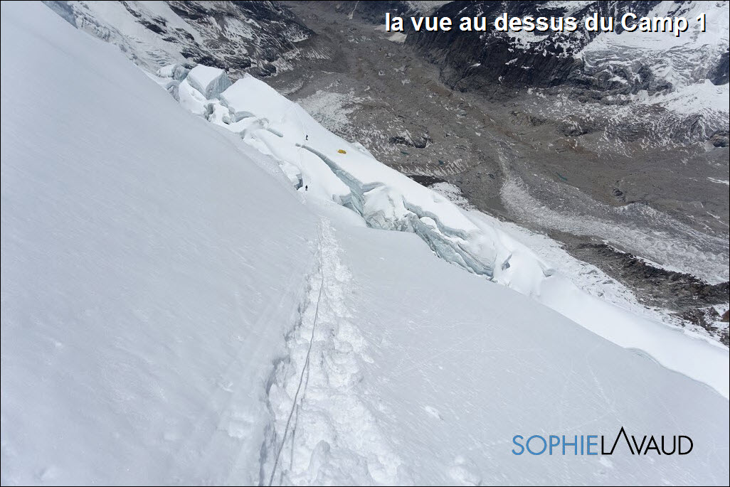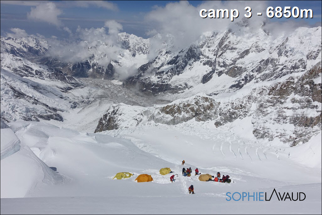 Au camp 2, le vent est fort en altitude, tout le monde décide de rester un jour au camp 2. Avec Naoko, mon amie japonaise et nos sherpas, nous décidons de poursuivre jusqu’au camp 3. Quitte à faire un palier, autant le faire plus haut, meilleur pour l’acclimatation du corps.