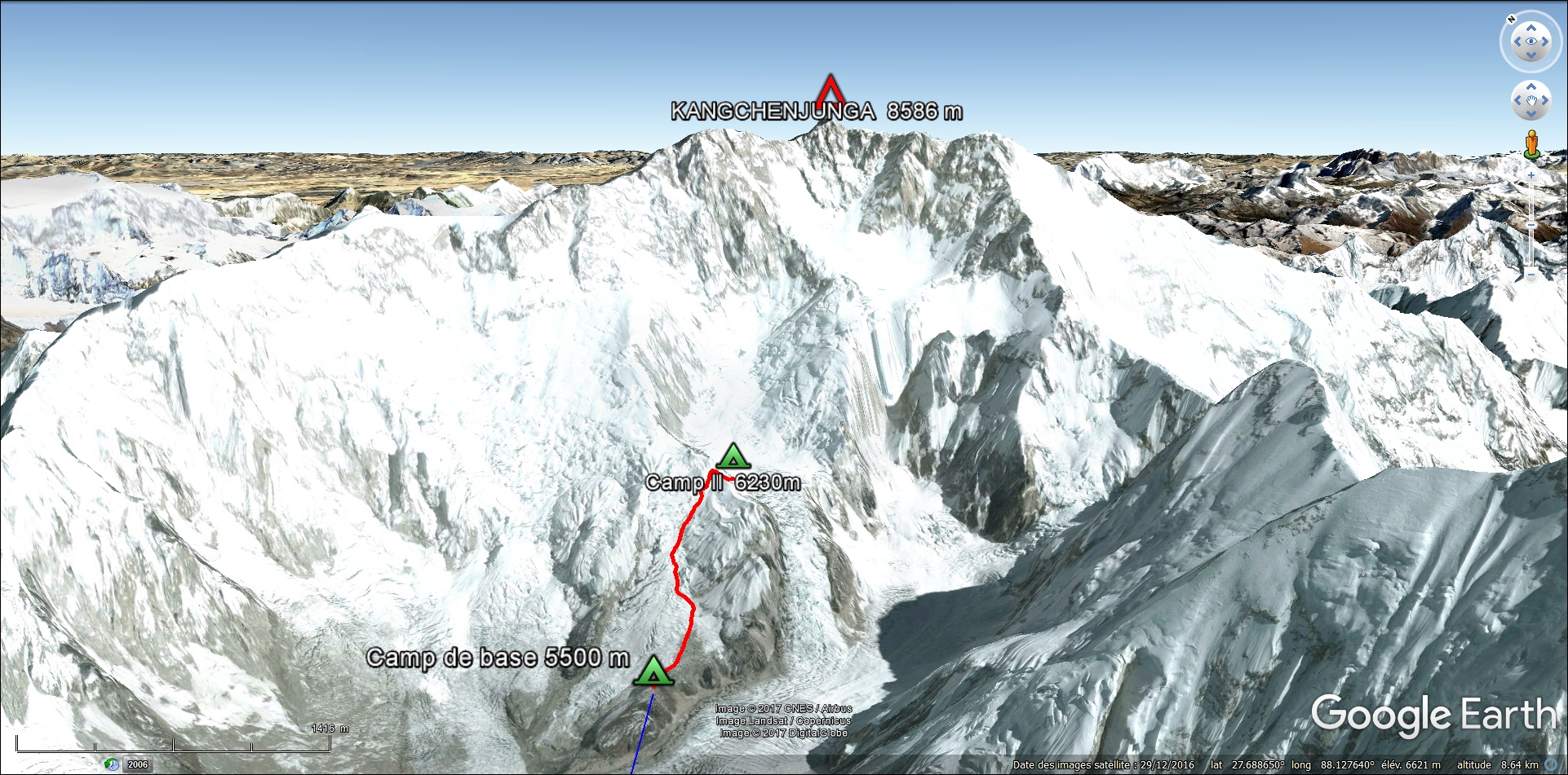 6 mai 2017Après un aller-retour au camp 2 (le 16 avril) et un séjour de repos au camp de base (à partir du 28 avril), Sophie est remontée aujourd'hui au camp 2 à 6230 m.[gallery type="rectangular" size="medium" ids="https://www.sophielavaud.com/wp-content/uploads/2017/05/trajet-BC-CII.jpg|tracé du camp de base au camp 2"]Position GPS du camp 2 : N 27 41.0092' E 88 7.0727' (http://inr.ch/BQ4RJNR)