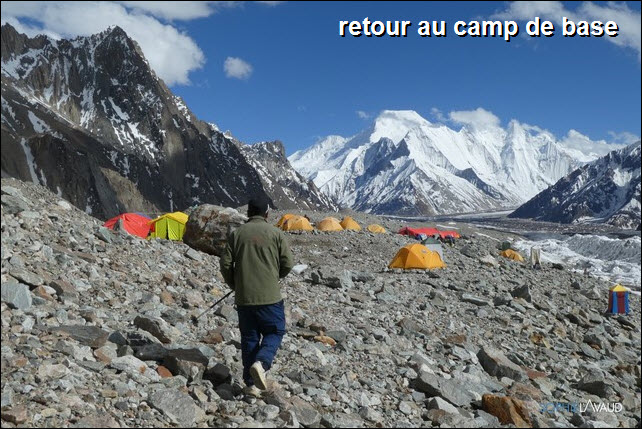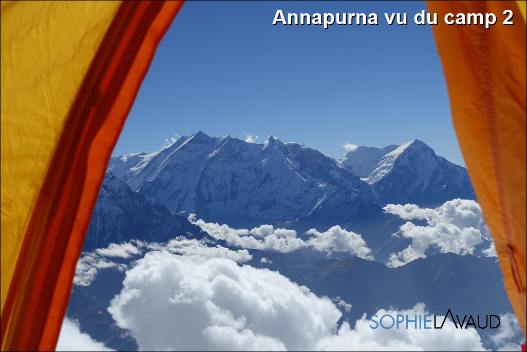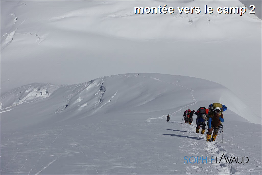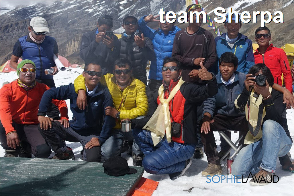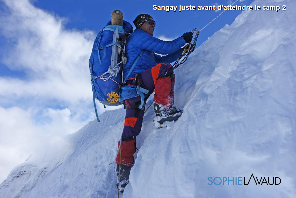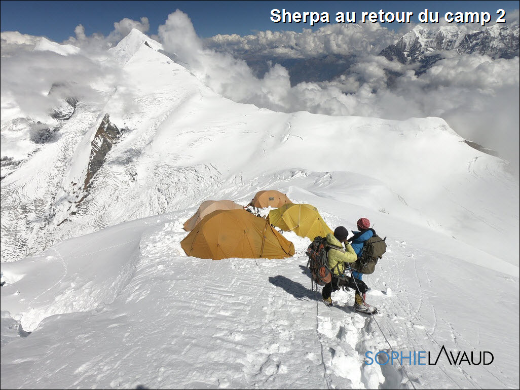La montée au Camp 1 a à nouveau été longue et pénible avec cette neige fraîche, plus de 9 heures cette fois-ci ; sans parler de la montée au Camp 2 à 6550 m le lendemain dans un bon 40 cm de neige fraîche jusqu’au petit éperon situé en dessous de la grande arrête qui mène au Camp 3. Météo parfaite, au petit matin, notre équipe sherpa avec celle de Kari Kobler a prévu de fixer le Camp 3 et nous devions suivre le lendemain. Malheureusement au bout de 3 heures, les 8 sherpas ont fait demi-tour, les conditions étant trop dangereuses. ""Essayé pas pu"" comme on dit et sans aucun doute, le souvenir de Dawa encore trop présent. De retour à la tente, avec Sangay, nous décidons de redescendre au camp de base dans la foulée. J’adore ces retours au camp de base, c’est toujours un peu comme un retour à la maison. Même si la température est en dessous de zéro, même si la seule toilette est avec des lingettes, même si on s’éloigne à nouveau du sommet, il y a ce sentiment de ""confort"" et de sécurité que j’apprécie tellement, sans compter la bonne nourriture préparée par Rinji et son équipe.