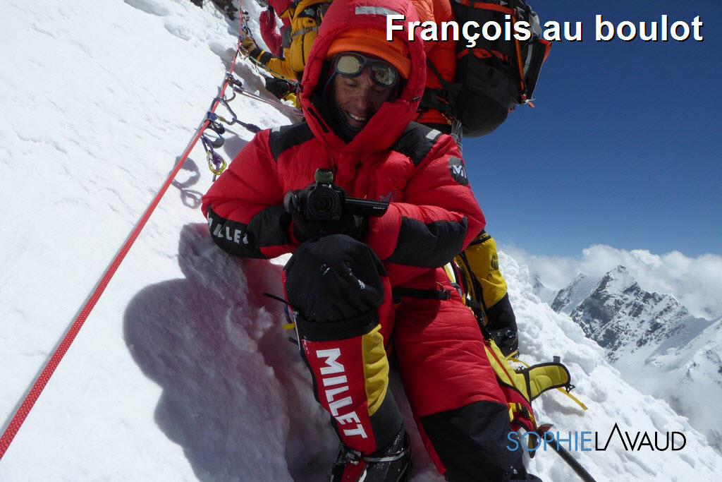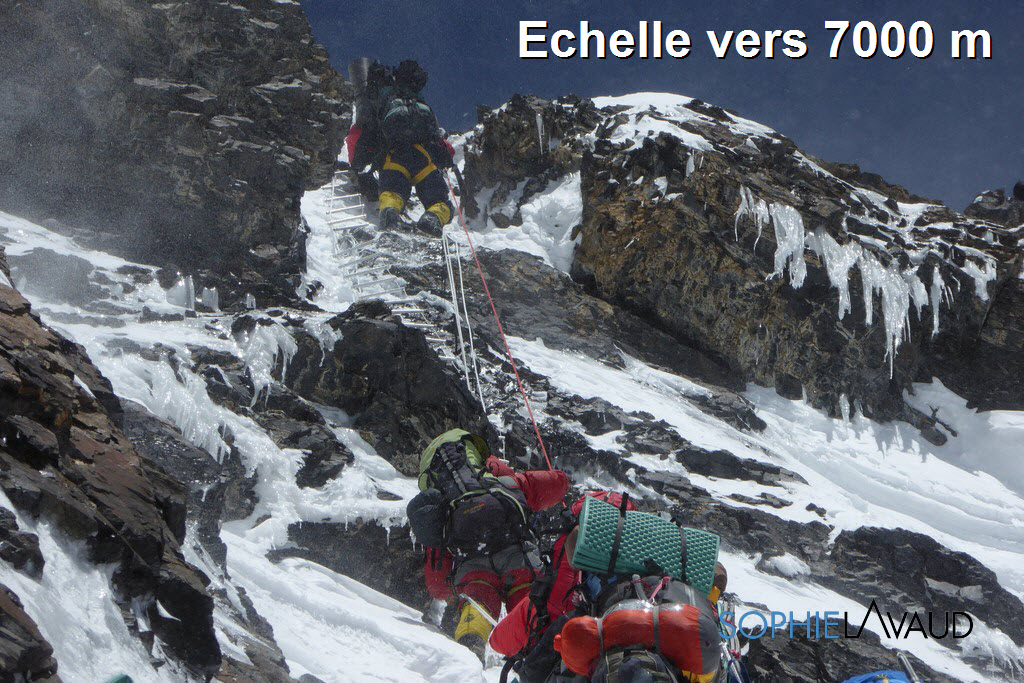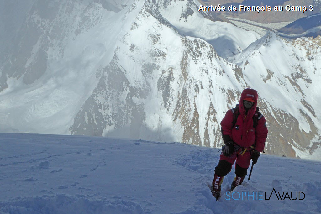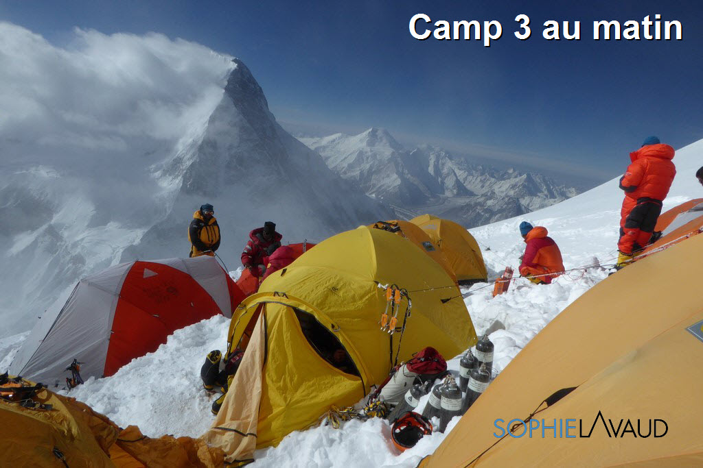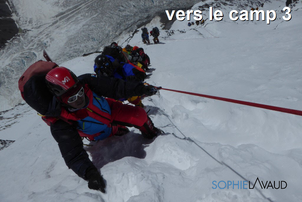 La montée entre le Camp 2 et le Camp 3 est interminable et extrêmement pénible, “inhumaine, dit François mais tellement belle” ! Pentes raides sans cesse entrecoupées de ressauts rocheux, de section de glace. Certaines expéditions sont déjà sous oxygène alors que nous tentons de trouver un rythme dans cet enfer à plus de 7000 m … Et nous sommes qu’à 7000 m !!…