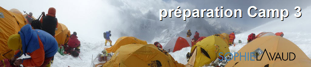 Épuisés, nous arrivons enfin au Camp 3 à 7300 m, il faut ensuite s’installer dans une tente que les sherpas ont montée (3 par tentes pour les membres et 4 voire 5 pour les sherpas). Je me retrouve entre François et Andreas, la tente est pleine de bouteilles d’oxygène, à cela il faut rajouter nos 3 gros sacs à dos, nos 3 paires de chaussures, les 3 matelas, il fait froid. Nous nous glissons dans nos sacs de couchage qui donne un effet de 3 gros saucissons collés. Ensuite, faire de l’eau et tenter de manger… Trop de vent à l’extérieur pour mettre le réchaud dans l’abside nous contraint à faire une petite plateforme avec les grosses chaussures, un qui tient le réchaud, l’autre la casserole et le 3ème qui fait fondre la neige. 3 soupes, 3 thermos, un morceau de fromage et 3 cracottes plus tard soit environ 2 heures, nous nous organisons pour la nuit. Chacun se cale tant bien que mal, tente de trouver une position sans trop gêner son voisin. Le vent secoue toujours la tente, il fait probablement entre -10 et -15° mais la chaleur des 3 sacs de couchage commence à faire son effet et à réchauffer les derniers orteils réticents. Mes voisins commencent à avoir un souffle plus régulier et à s’endormir… et c’est là que moi j’ai envie de faire pipi !!! …